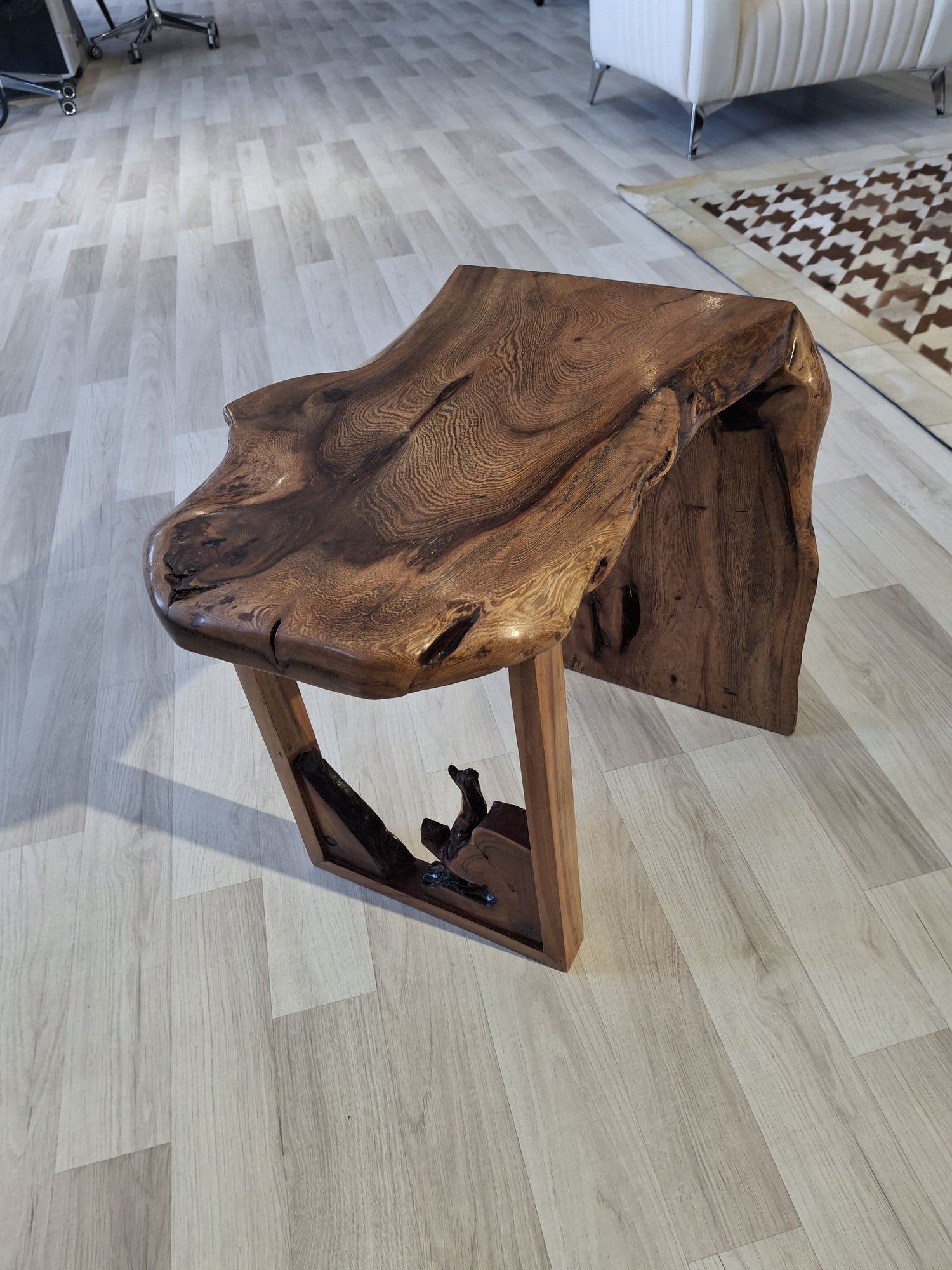 Tea table manufactured from solid natural wood featuring a naturally contoured live-edge top, carefully sanded to preserve the natural wood grain and texture. The surface is treated with a transparent protective coating resistant to liquids and scratches, while maintaining the original wood color and finish.